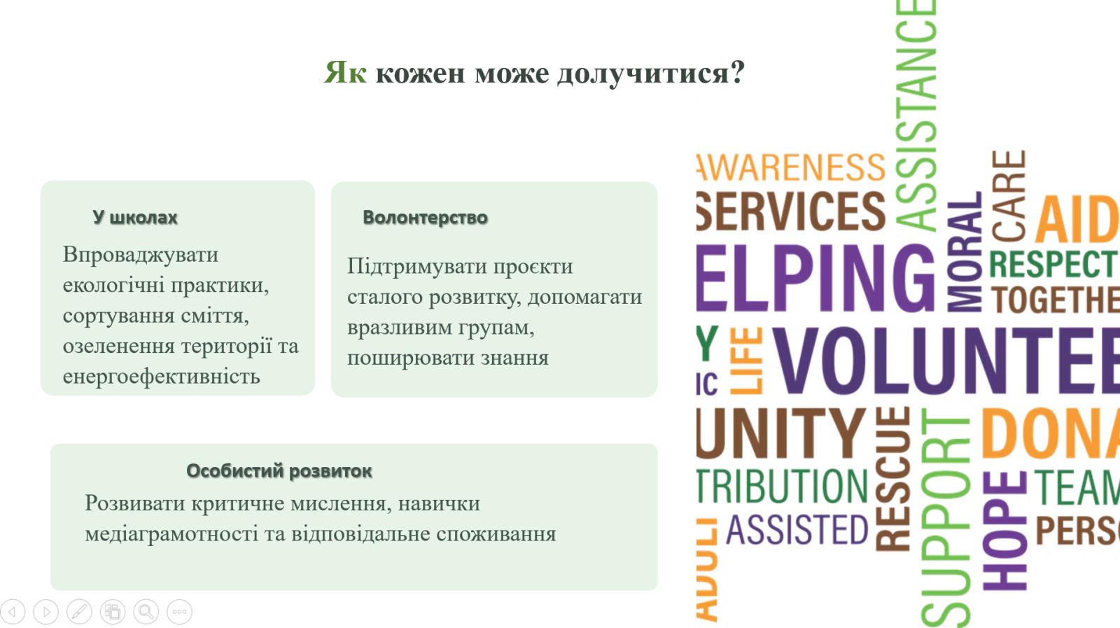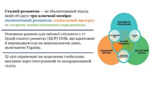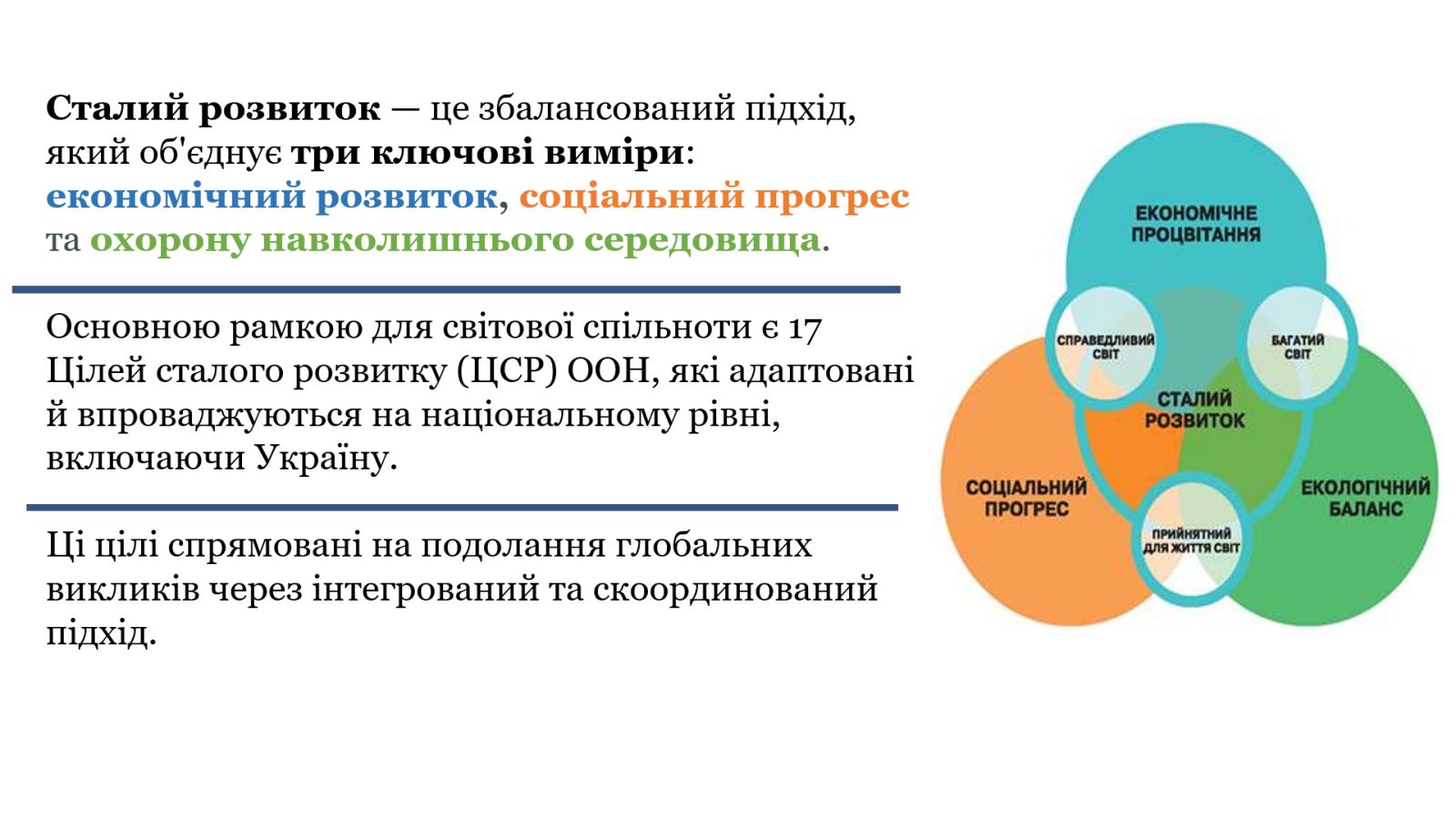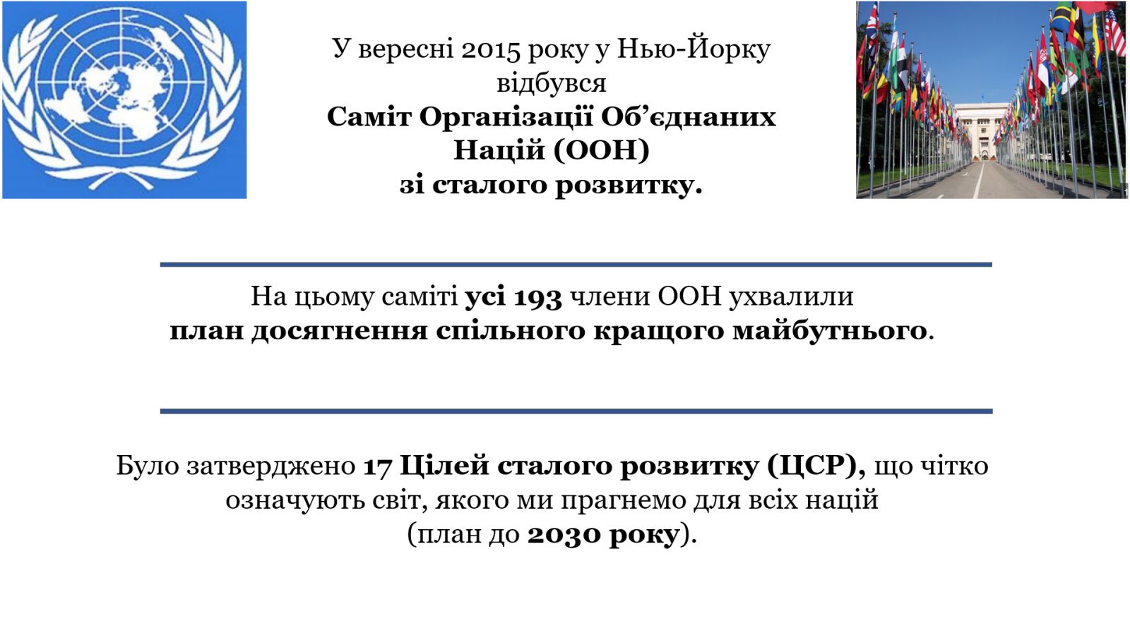 Цілі сталого розвитку – це 17 глобальних цілей, ухвалених ООН у 2015 році, які мають бути досягнуті до 2030 року. Вони спрямовані на: подолання бідності, збереження довкілля, забезпечення добробуту та рівних можливостей для всіх.