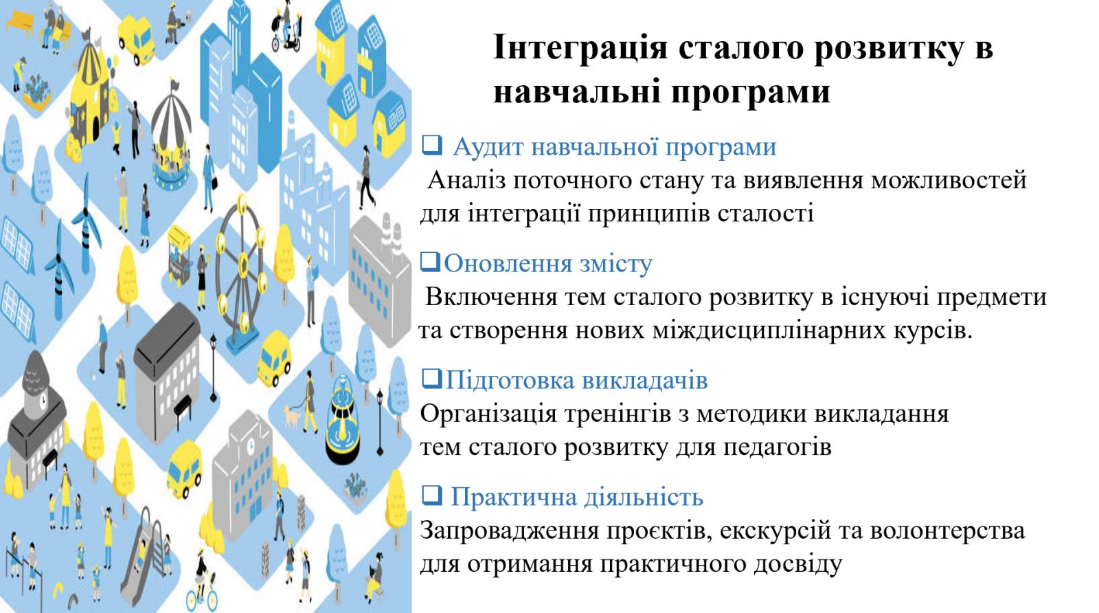 Цілі сталого розвитку слід використовувати в освіті, а саме: у змісті освітніх компонентів (інтеграція тем екології, здоров’я, прав людини), міждисциплінарний підхід (біологія + хімія + соціальні науки, гігієна з гігієнічною експертизою, гігієна з основами екології та технікою санітарно-гігієнічних досліджень, безпека життєдіяльності та охорона праці в галузі, охорона праці в галузі, безпека життєдіяльності, основи екології та профілактичної медицини); у формуванні компетентностей (освіта для сталого розвитку формує: критичне мислення; екологічну та соціальну відповідальність; здатність приймати обґрунтовані рішення); у практичній діяльності (проєктне навчання; волонтерські та соціальні ініціативи; дослідницькі роботи, пов’язані з реальними проблемами громади).