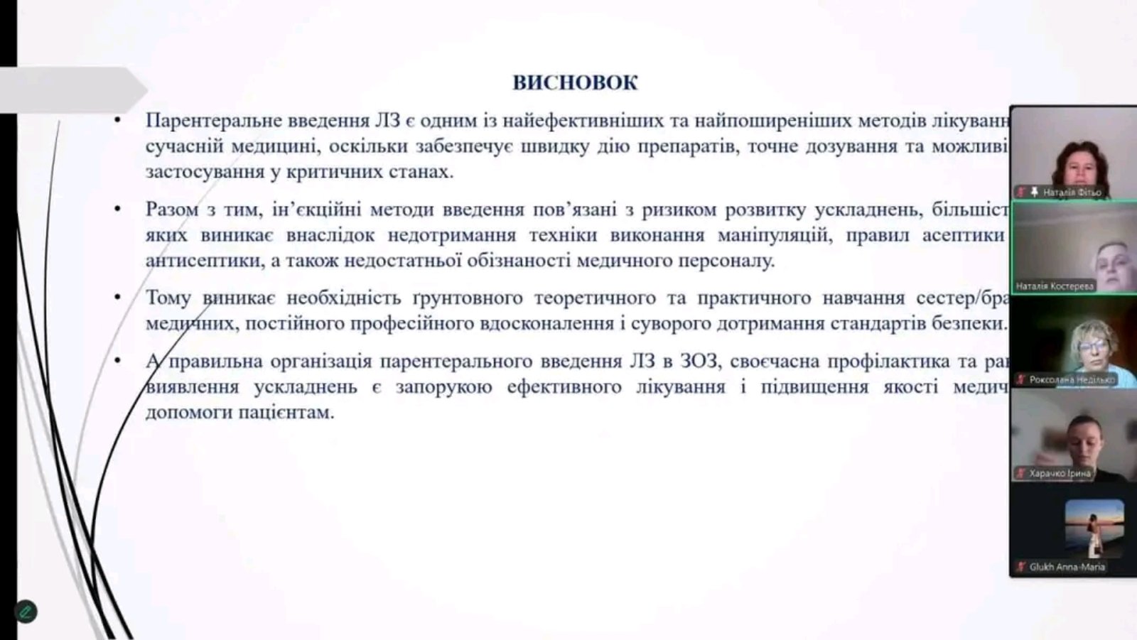 Наталя Василівна чітко сформулювала актуальність, мету, логічно структурувала матеріал, послідовно розкривши основні поняття парентерального введення лікарських засобів, види та ускладнення ін’єкцій. Акцентувала увагу на сучасних методах проведення маніпуляцій: застосуванні шприц-ручок, інсуліновій помпі, інфузоматі, периферичних внутрішньовенних катетерів, вакуумних системах для забору крові, тощо.