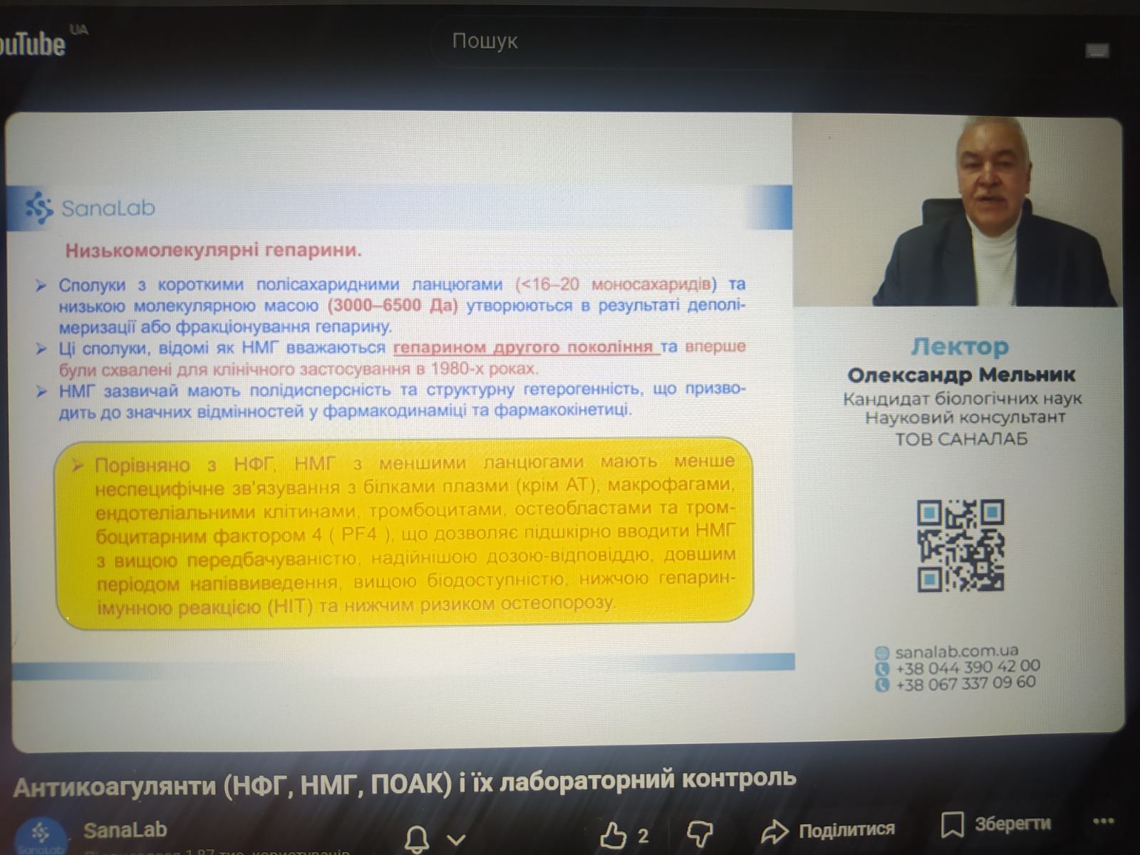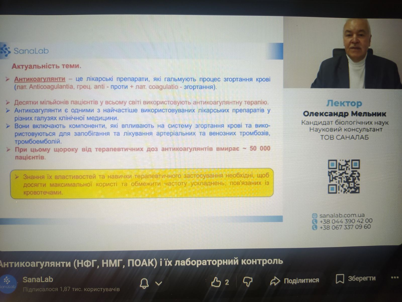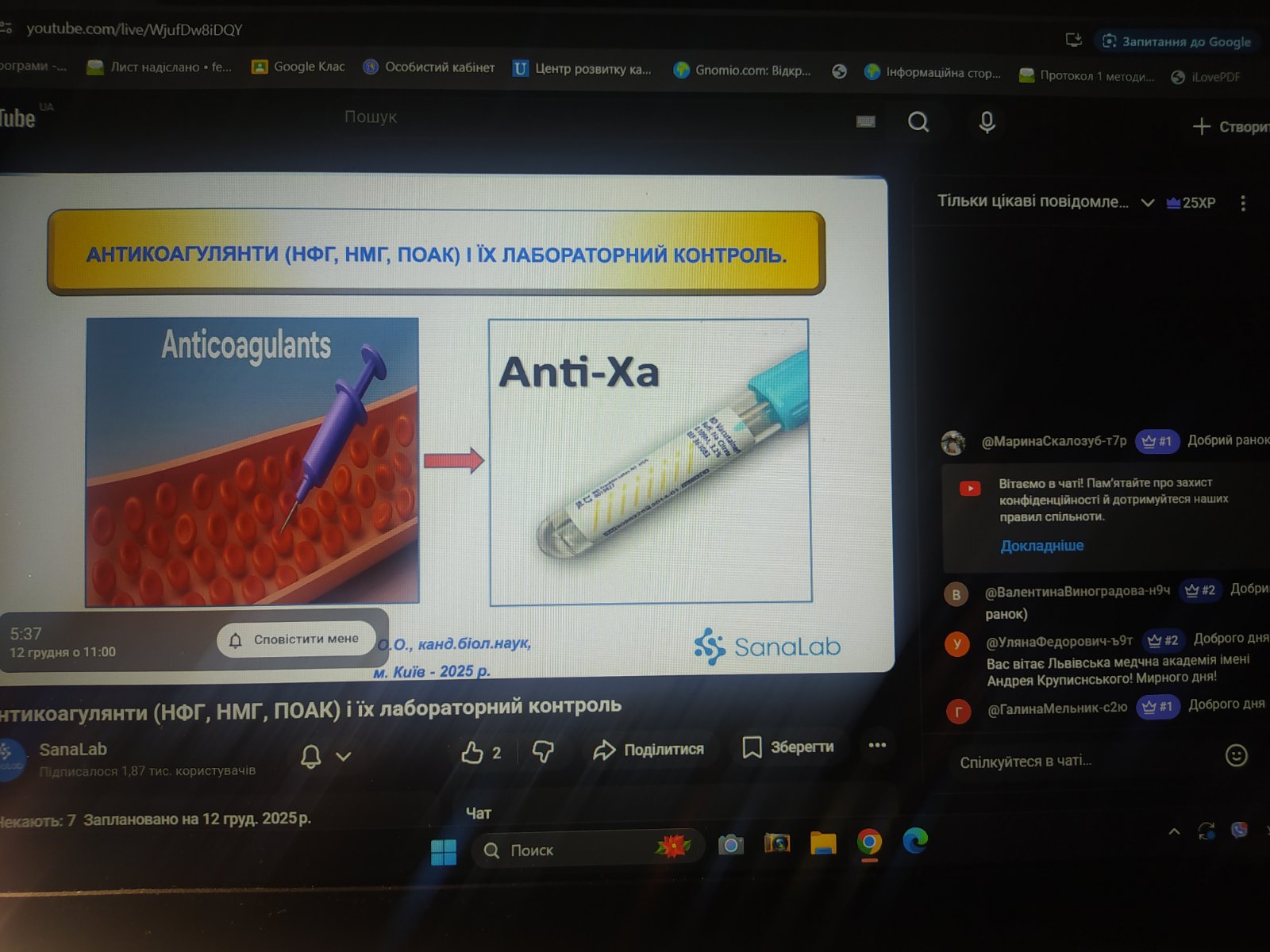 12 грудня 2025 року викладачі кафедри лабораторної медицини взяли участь у лекції для лікарів-лаборантів, сімейних лікарів, кардіологів, акушерів-гінекологів на тему: “Антикоагулянти (НФГ, НМГ, ПОАК) і їх лабораторний контроль”.
