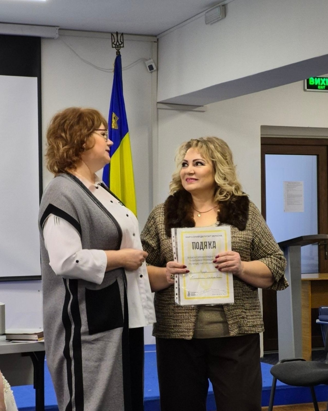 04.03.2026р. на засіданні Методичної Ради Академії викладачеві Відділення №2 Світлані Назар за багаторічну плідну працю та активну громадянську позицію була вручена нагорода – Подяка від одного з депутатських корпусів Верховної Ради України.